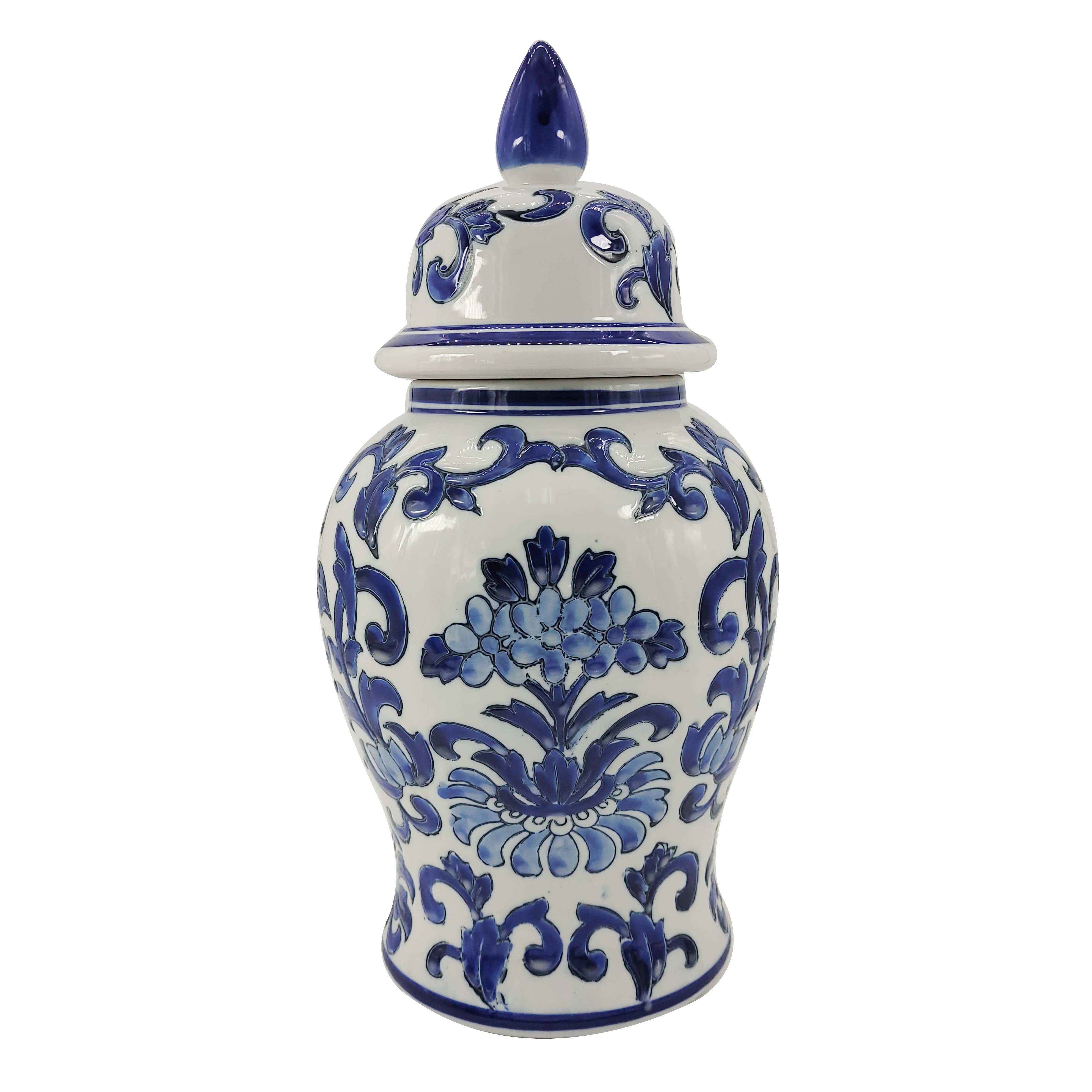 Blue & White Chinoiserie Ceramic Temple Jar 14"