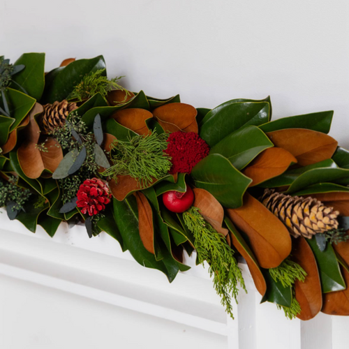Designed specifically to complement the English Holiday Estate Wreath, this fresh magnolia garland is no stranger to proper festive splendor! The rustic coppery undersides of our magnolia leaves are on full display, providing an impeccable stage for accents of verdant boxwood, moss, and fir. Cherry red pomegranates and yarrow curate the classic Christmas color palette throughout the garland. An absolute seasonal must-have for your personal palace!