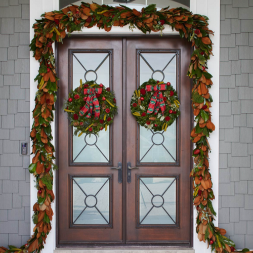 English Holiday Estate Fresh Magnolia Garland– Magnolia, Boxwood, Fir & Tartan Ribbon