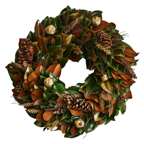 Crown your doorway with a glistening circlet of nature’s finest! A ring of fresh greenery from the regal evergreen Southern Magnolia is the heart of this magnificent arrangement. Golden lacquered accent leaves and pomegranates are positioned like sparkling jewels throughout, while shimmering pinecones, twigs, and feathers bring the piece back to nature. A captivating style for your doorstep!