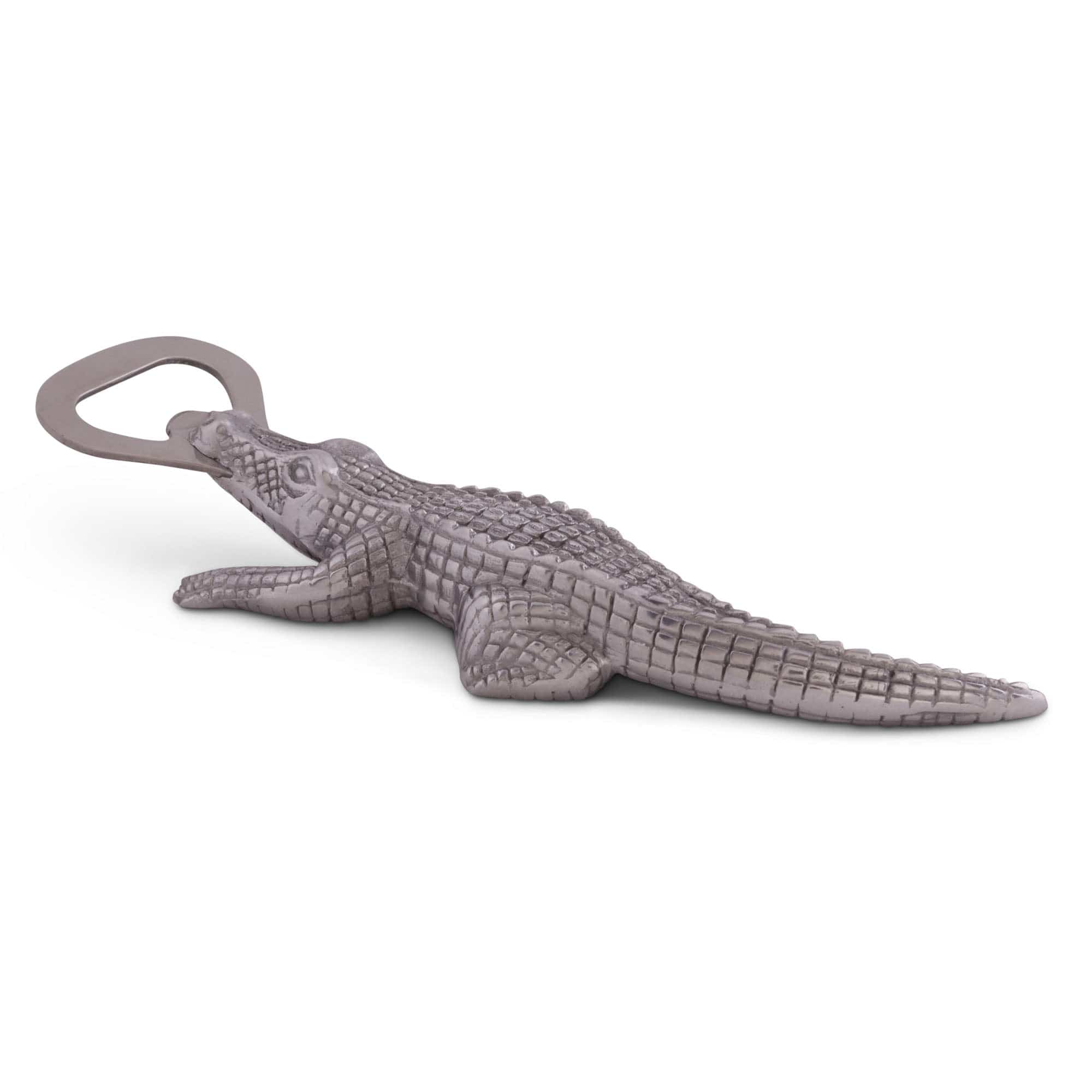 Wonderfully detailed in Arthur Court's signature aluminum, this scaly alligator bites down, holding the stainless steel bottle opener with its powerful jaws. The remarkable definition in the creature's hide gives this statuette like opener a rough, naturally appealing texture.