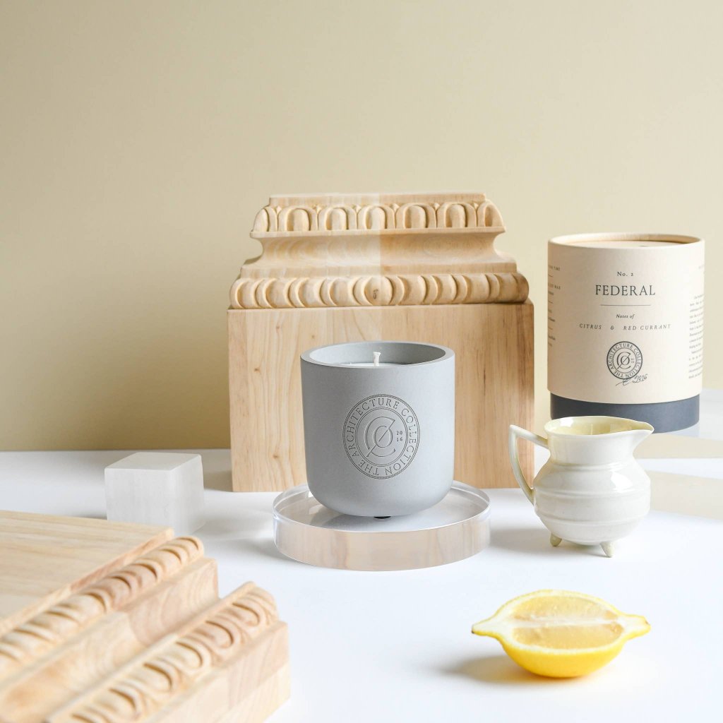The Architecture Collection features debossed concrete vessels with a burn time of of 55 hours.