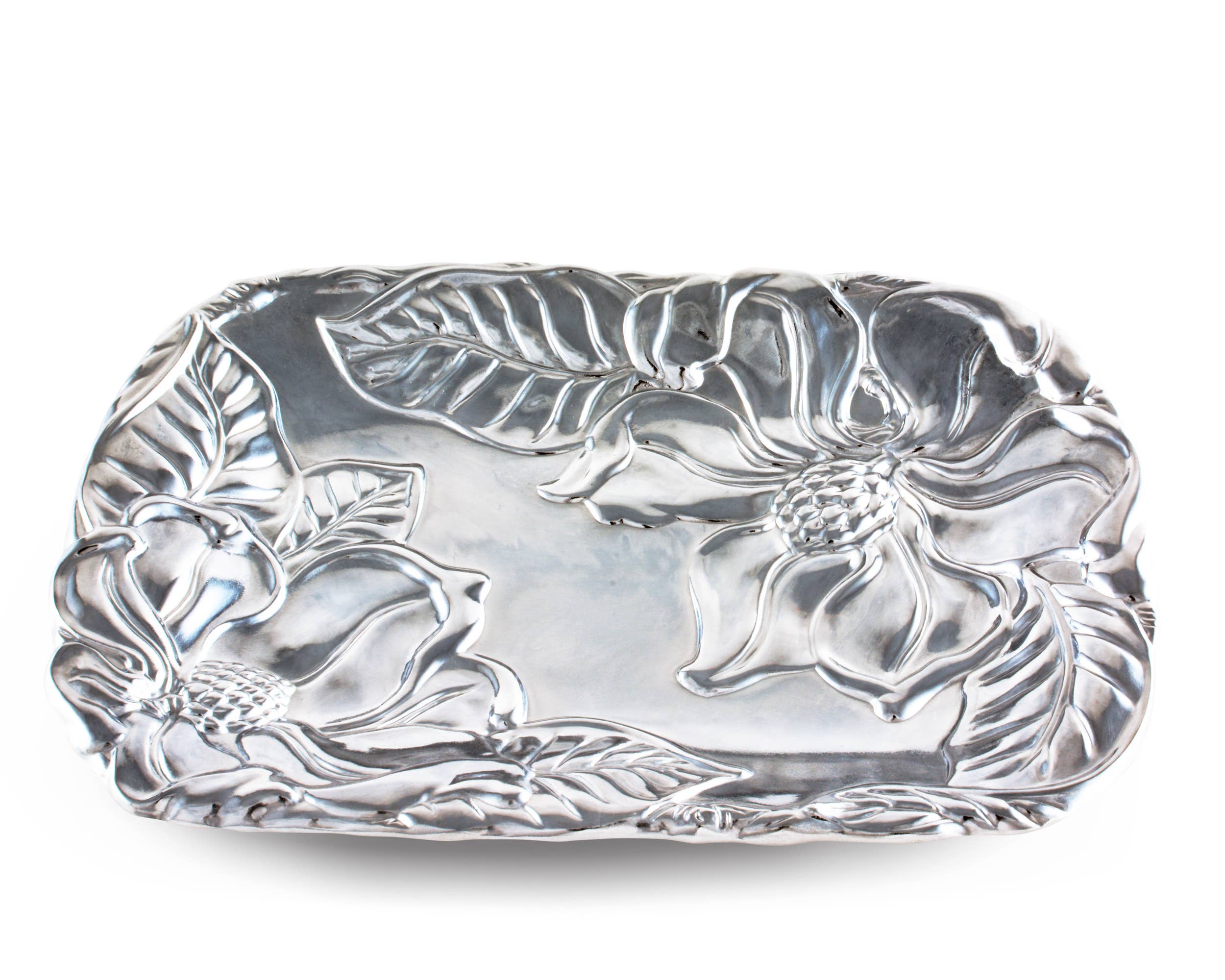 Exploit the decorative appeal of this beautiful flower by using Arthur Court's Magnolia Catch All. The magnolia's defined carpels and petals mix with heavy lines in the leaves to create breathtaking realism. The unblemished areas of this handmade, aluminum piece gleam against the textured designs. Size: L: 9.5" / W: 7.0" Care: Wash by hand with mild dish soap and dry immediately - do not put in dishwasher.