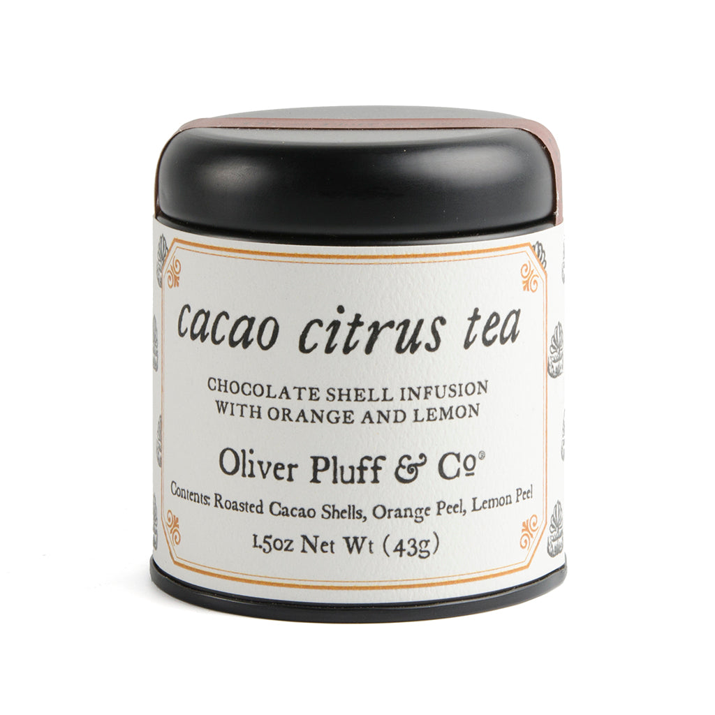 Martha Washington's Cacao Shell Tea Tin - 1.5oz loose roasted cacao shells, blended with dried citrus peel - orange peel and lemon peel.