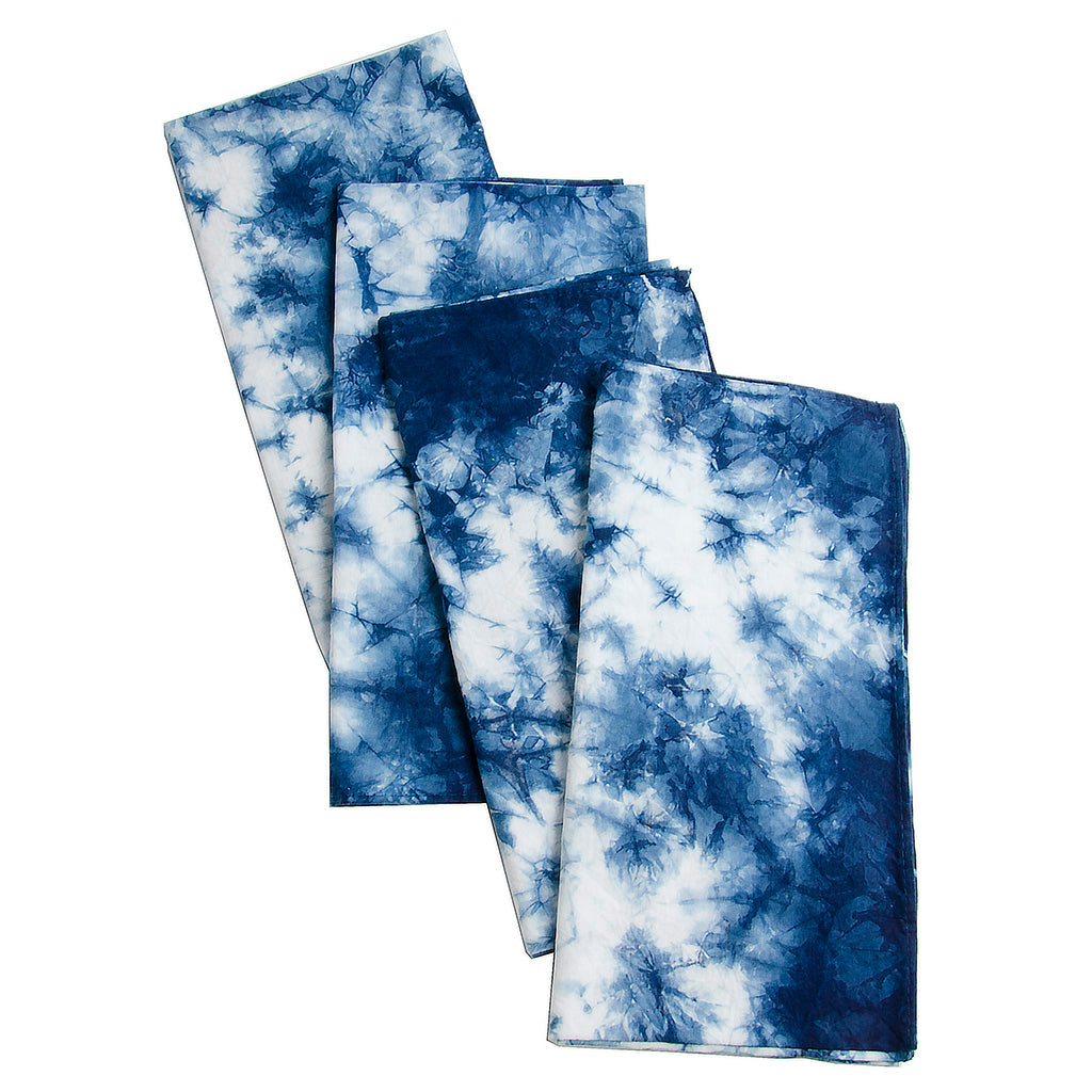 Each napkin is bunched up and tied. They are then dipped 3 times in an indigo bath. The indigo is grown and processed in South Carolina. This is an elegant and bright pattern stunning on any tabletop.