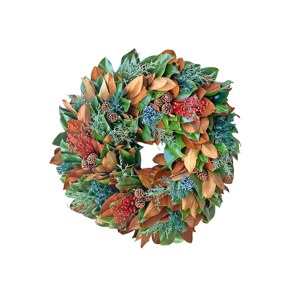 Warm touches of holiday red berry are mixed with fresh Carolina sapphire and miniature pinecones. Textured grandiflora and little gem magnolia leaves are handcrafted to create a new holiday favorite!