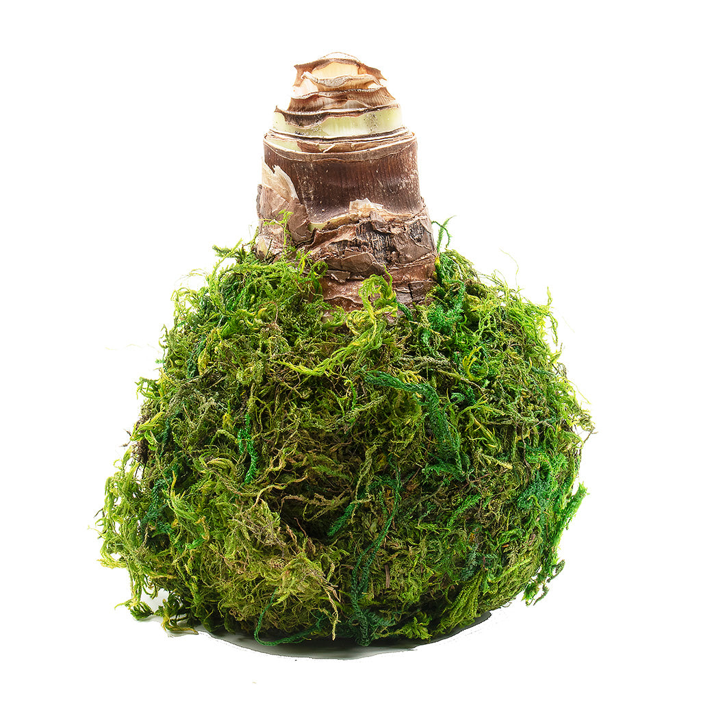 • Moss-covered waxed amaryllis bulb with self-supporting base