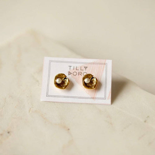 Expertly crafted and designed for everyday elegance, these oyster studs are the perfect accessory for any occasion. The small gold cups are delicately made and feature a stunning pearl enclosed inside. Measuring just 1/3" in diameter and plated with 24k gold, these studs are the epitome of luxurious style. Secured with bullet clutch backings, these studs offer both comfort and sophistication.