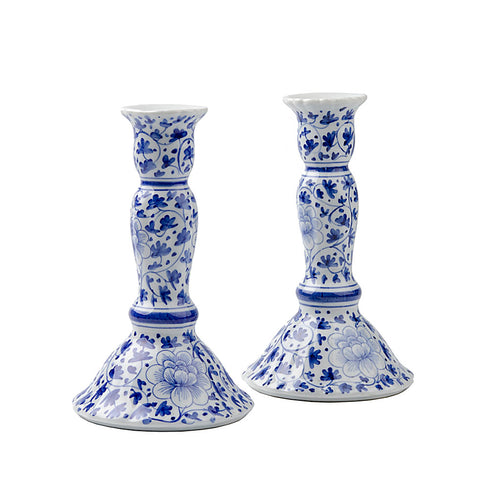 A timeless addition to any blue-and-white collection, these traditionally shaped porcelain candlesticks bring classic charm to your display. Featuring a delicate hand-painted floral design, they pair beautifully with many of our other pieces for a coordinated look. Each candlestick measures approximately 7" tall and holds a standard taper. Some variations may feature a soft, creamy white background, adding to their unique character. These candlesticks are hand-painted, so expect and enjoy subtle differences that make every piece one of a kind.