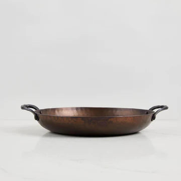 The round roaster is a stunning and versatile kitchen companion designed to move seamlessly from stovetop to oven to table. With a large cooking surface and optimum depth, the round roaster is at home searing pork chops, roasting vegetables, sautéing shrimp, braising short ribs, and even baking a casserole. Hand-forged and limited in quantity, each round roaster is visually unique while sharing fundamental design elements including hand hammered handles with a texture designed for easy gripping and a beautiful pre-seasoned interior finish. With performance that rivals cast iron at a lighter weight, this roaster is a perfect gift for the cook who has everything.