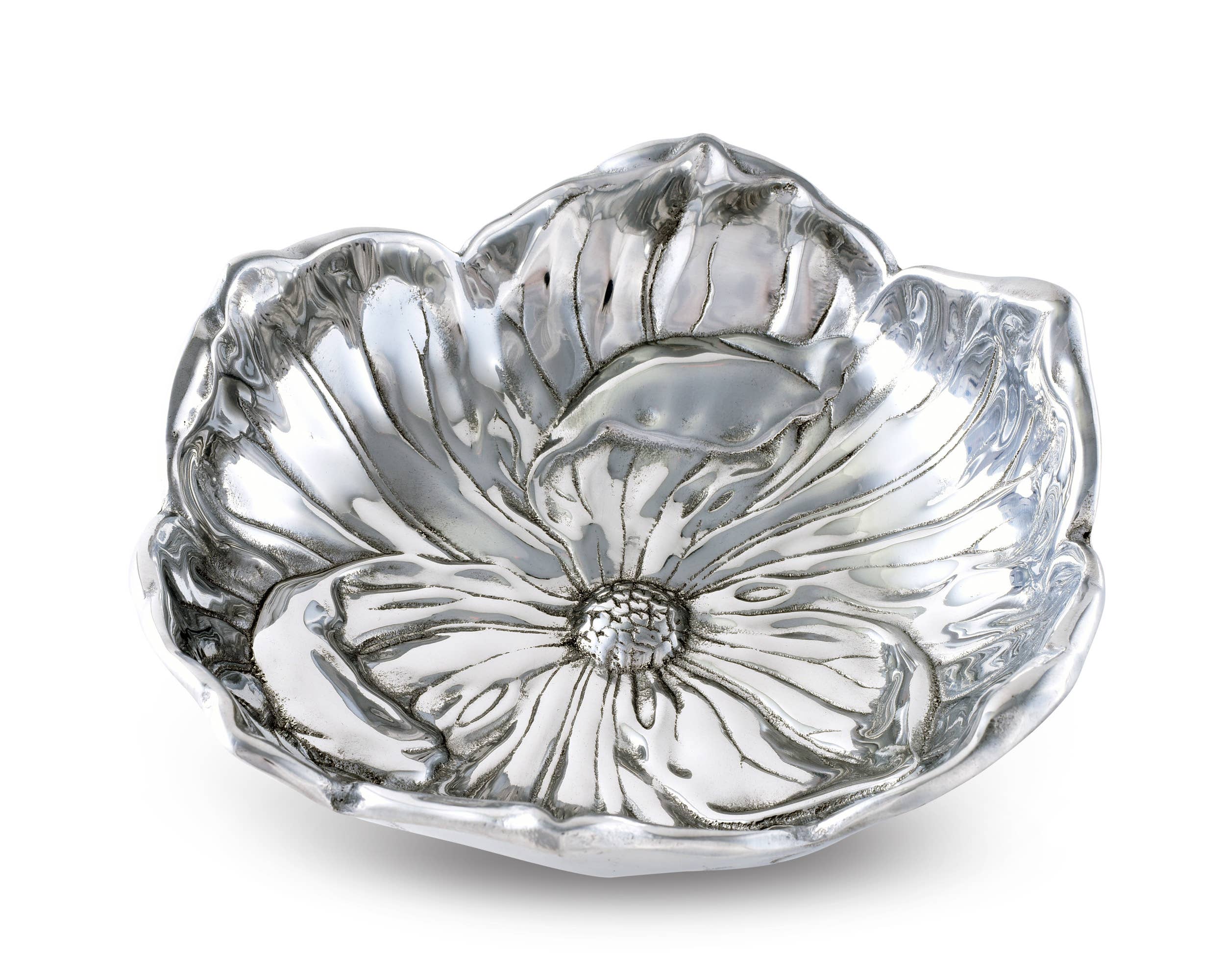 Fill the room with flowers and food using this beautiful 10" Magnolia Bowl from Arthur Court. A single magnolia lends its shape to this piece as the edges reflect the flower's arching pattern of petals. Heavy lines extend in all directions from the centralized carpels to give this handmade, aluminum bowl incredible texture and depth.