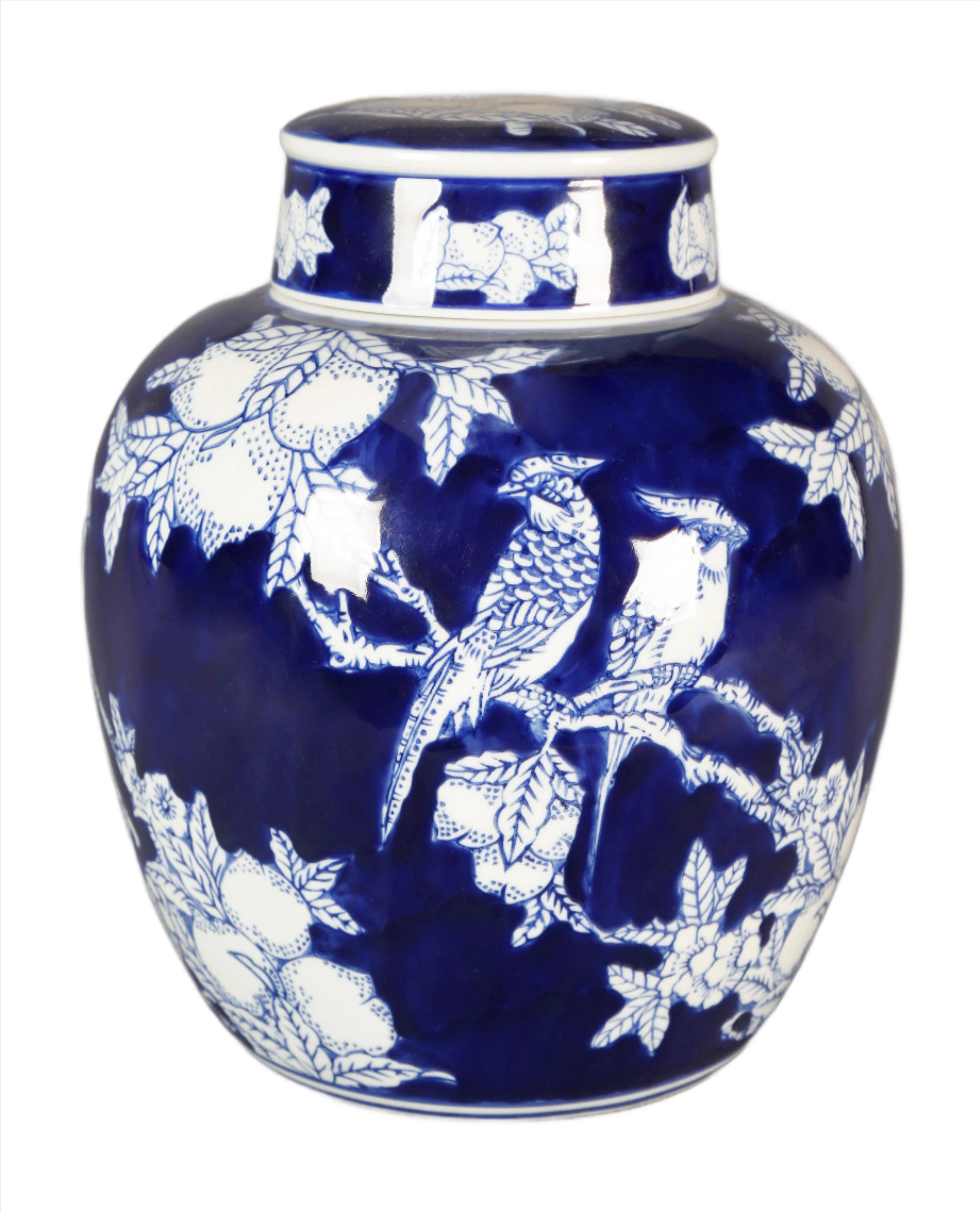 This stylish jar features a white birds and fruits design on a hand colored dark blue back ground. Ginger jars are a great way to add color and style to any room. The inside of the jar is glazed making the jar water tight.