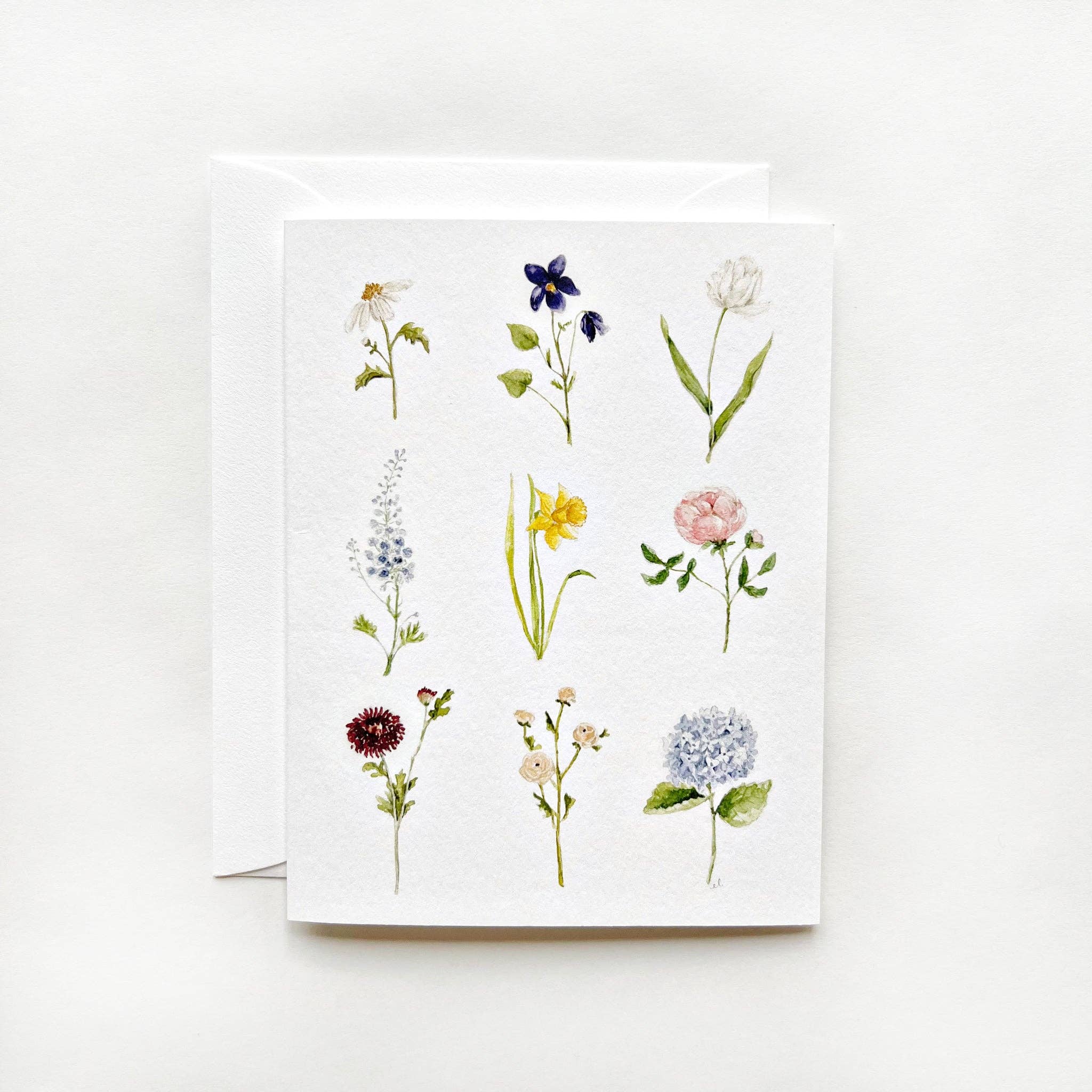 Send sweet greetings to your loved ones. The garden flower notecards are blank on the inside with charming watercolor illustration of favorite garden flowers on the front. Included in the illustration are: hydrangea, tulip, daisy, delphinium, garden rose, dahlia, daffodil, violet, and ranunculus. They bring a touch of beauty to your thank-you notes, housewarming gifts, get-well wishes, and more. Details: - set of eight folded cards + envelopes - blank inside - 5.5" x 4.25" - Printed on 120lb superfine paper - Original watercolor artwork by Emily Lex