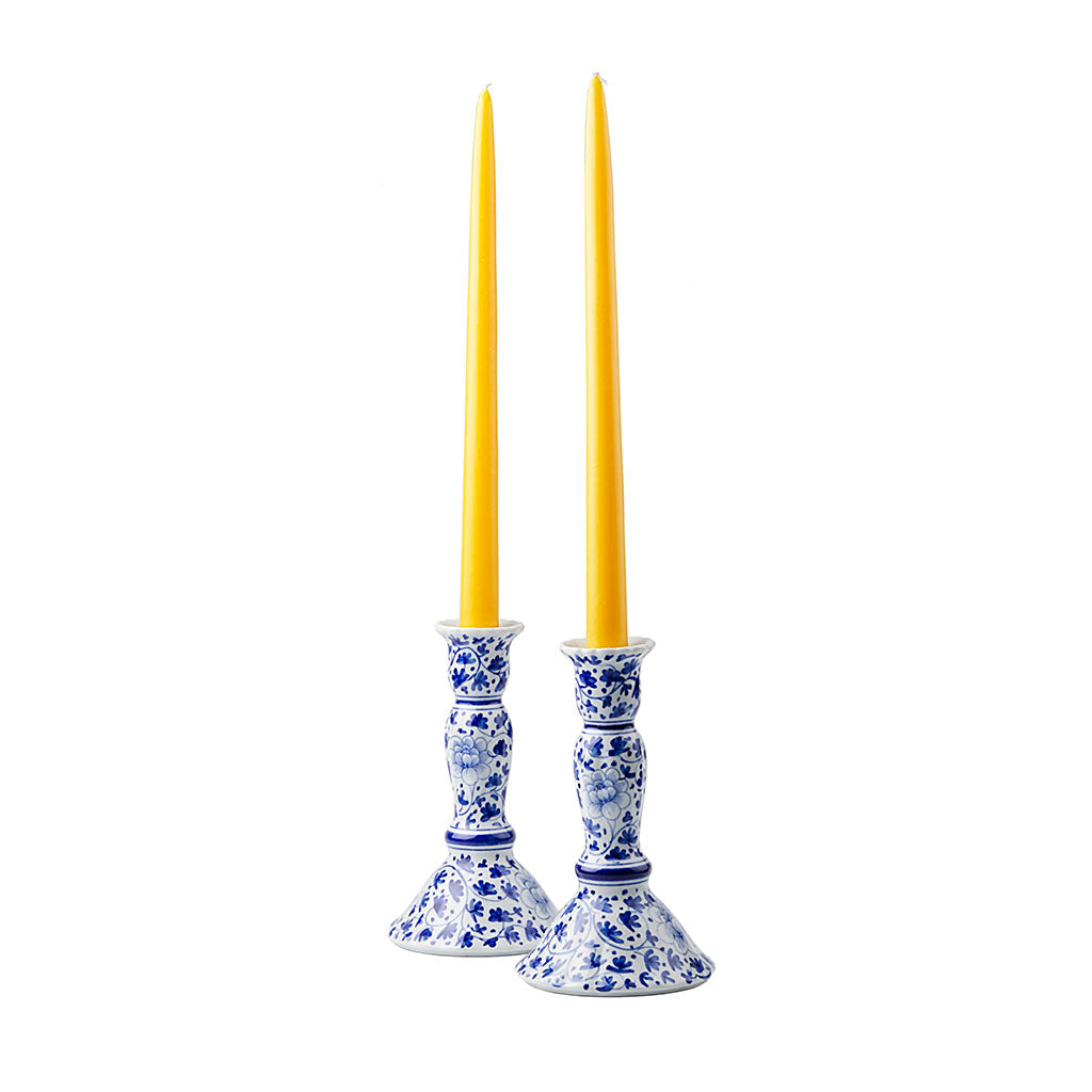 A timeless addition to any blue-and-white collection, these traditionally shaped porcelain candlesticks bring classic charm to your display. Featuring a delicate hand-painted floral design, they pair beautifully with many of our other pieces for a coordinated look. Each candlestick measures approximately 7" tall and holds a standard taper. Some variations may feature a soft, creamy white background, adding to their unique character. These candlesticks are hand-painted, so expect and enjoy subtle differences that make every piece one of a kind.