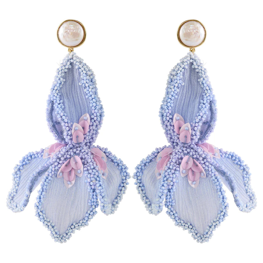 This stunning lily earring symbolizes both happiness and tranquility. In full bloom, this gorgeous three-dimensional embroidery highlights malleable chiffon petals adorned in tonal beading and finished with lilac sequins.