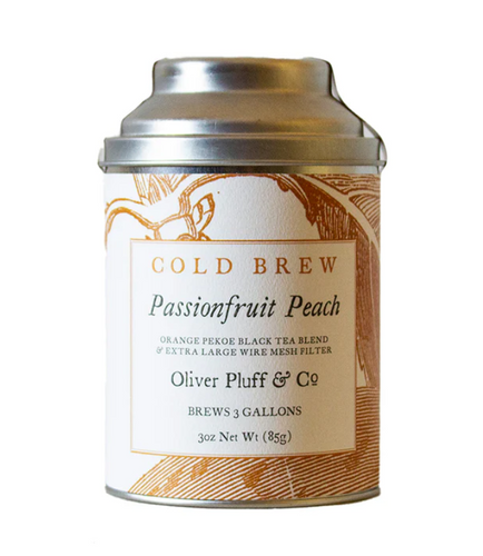 Each Oliver & Pluff cold brew tea tin arrives with a large wire mesh tea brewing ball for gentle steeping that results sweeter and smoother finished fruit forward brewed tea perfect for warmer weather.