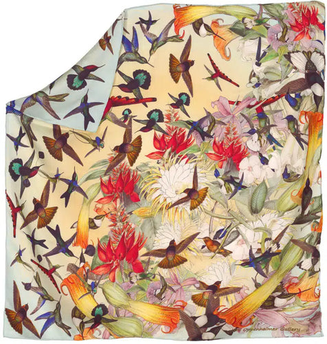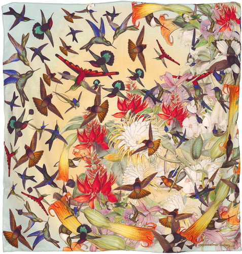 This inaugural scarf collection reimagines renowned works by natural history artists John James Audubon, John Gould, and Dr. Robert John Thornton. Expanding upon their themes, the ornithological and botanical subjects they depict are brought to life in meticulously conceived original designs by artist and gallery owner Joel Oppenheimer.